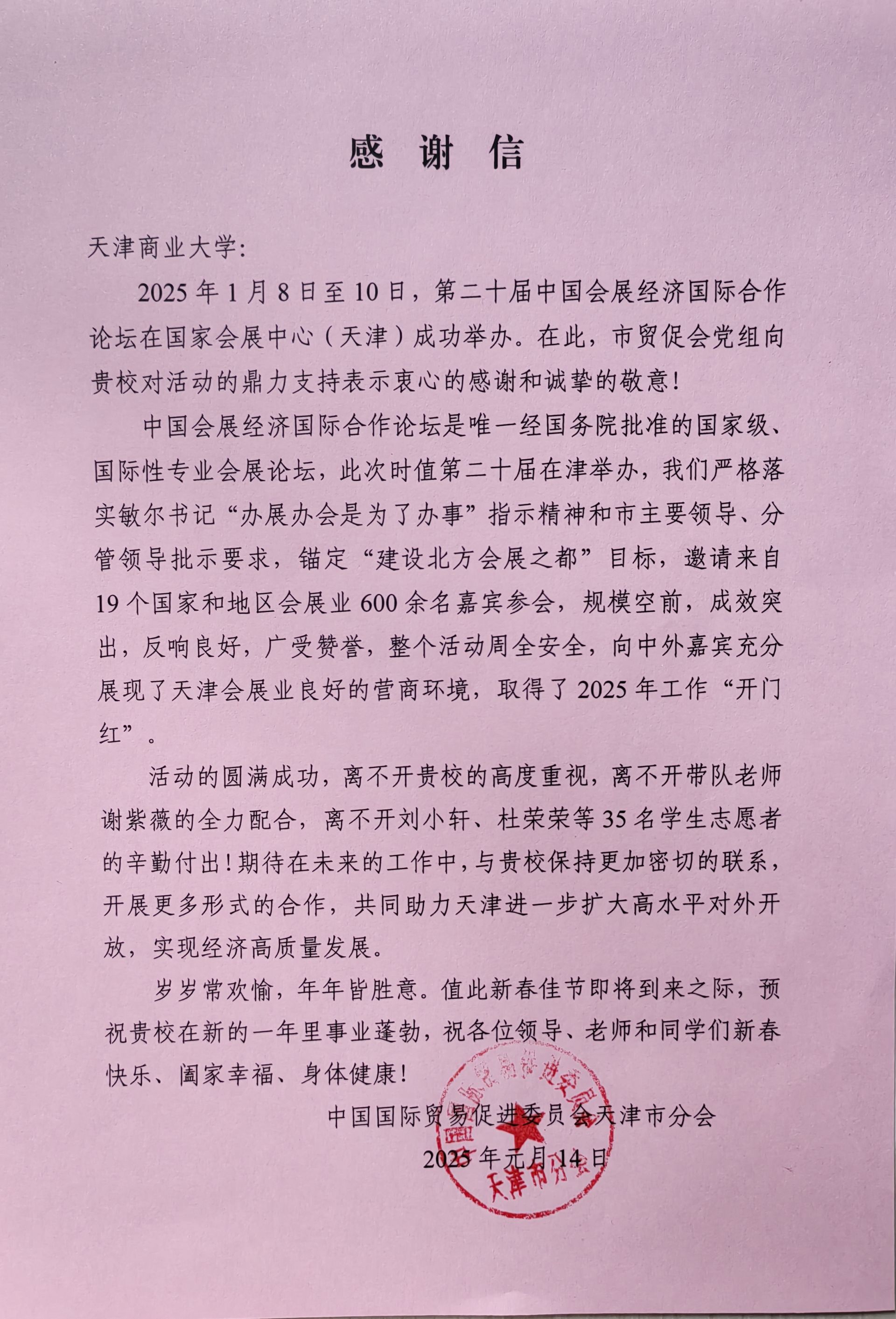 3月26日,中国国际贸易促进委员会天津市分会商法中心主任蔡颖一行到访大白菜官网,就学校35名学生在第二十届中国会展经济国际合作论坛提供的高质量志愿服务,表达诚挚谢意,并发来感谢信。外国语学院党委书记刘桂涛、党委副书记孟凡荣及相关教师出席会议,双方围绕志愿服务、人才培养等议题展开深入探讨。