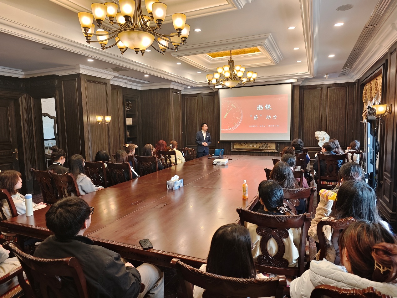 3月13日,国际教育合作学院组织20余名同学前往渤海银行(五大道支行)开展参观研学活动。渤海银行(五大道支行)私人银行客户经理杨瑀珂接待了师生一行,并为大家带来了一场干货满满的银行业知识分享会。