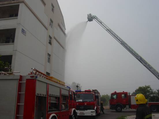 此次演习消防支队共出动两个中队、52 名官兵,消防水车 4 部、可达 30 米高的消防云梯车1 部。 他们在支队张参谋长的指挥下,勘察了学校教学楼、办公楼及宿舍楼等相关情况,并选定在南区 6 号学生公寓 进行了演练。 演习模拟了校舍着火、烟雾弥漫封锁楼道、高楼层人员被困等火灾情形,有针对性地进行了相应的脱困及扑救模拟演示。