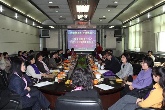 在“三八”国际劳动妇女节到来之际,校工会于 3 月 5 日下午,在办公楼多功能会议室召开了“弘扬巾帼楷模精神,树立师德高尚风范”为主题的庆祝“三八”国际劳动妇女节 100 周年座谈会。座谈会由校党委副书记、工会主席史习红主持,校长刘书瀚出席并讲话。校长助理、财务处处长李真、校长助理、国际教育学院院长寇小萱、工会常务副主席宋树发、组织部部长李新锁、宣传部副部长张克明、人事处副处长罗庆丰、校工会女工主任卫弘出席会议。全校历届市级以上女劳模、女优秀教师代表、工会女工委员及各界妇女代表共 50 余人参加座谈会。